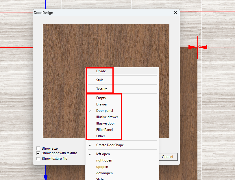 7. Next, we right-click the panel that has the door material and select the type of panel you would like the door design to look like