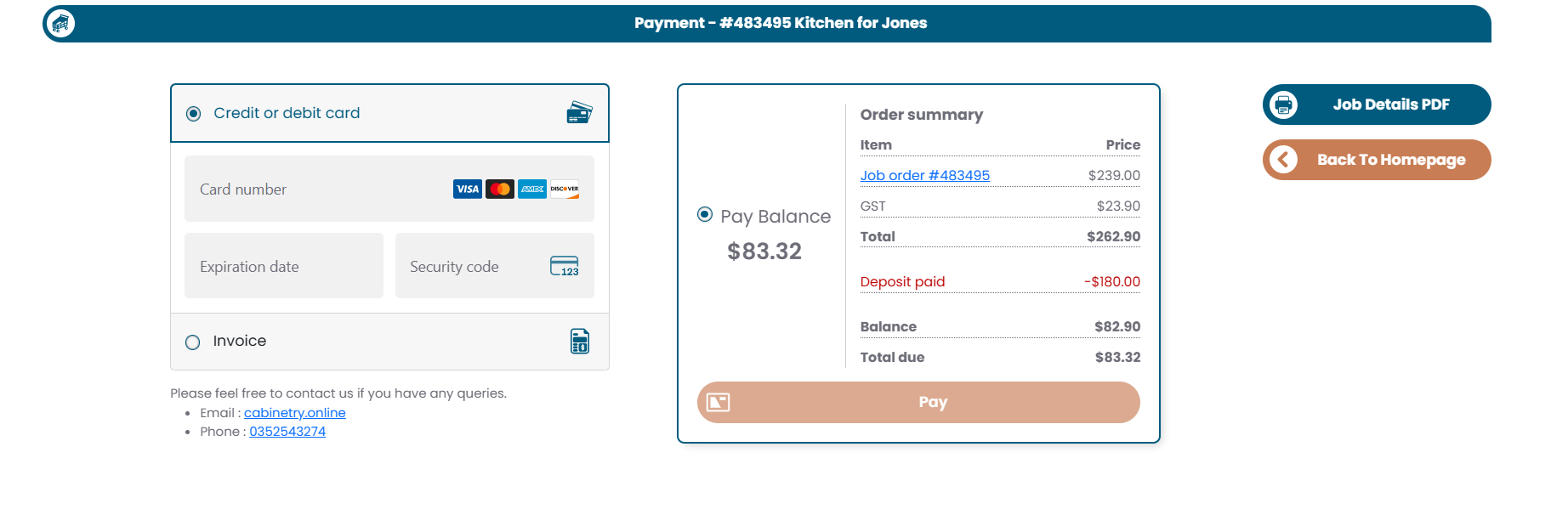 If a deposit has been paid, the customer will instead see a Pay Balance option.