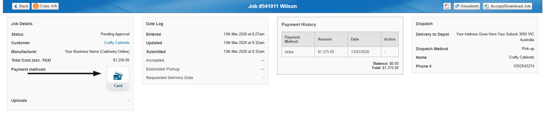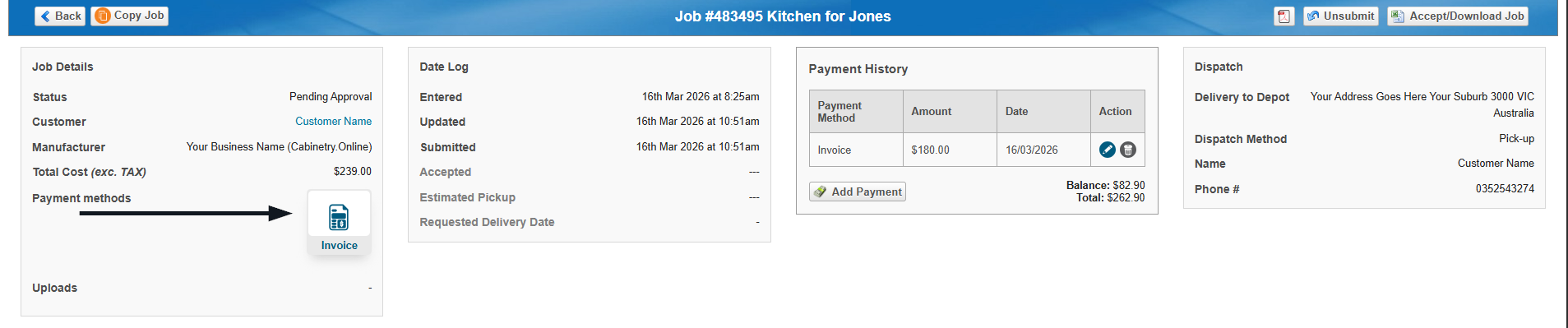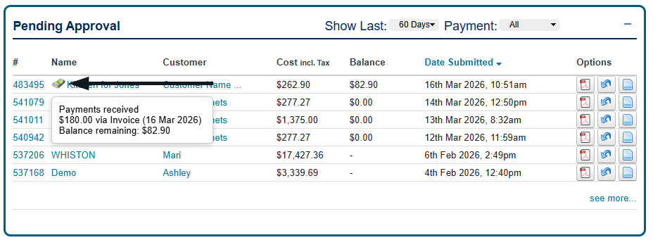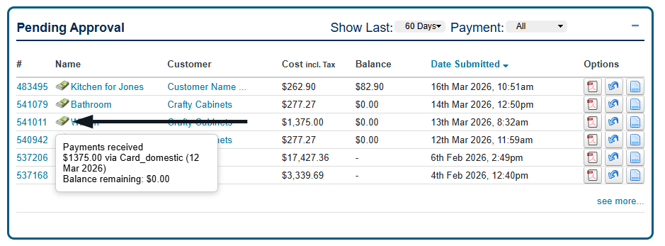 A new icon will display for jobs paid via the new payment settings. This will outline if a payment has been received, and by what method. (Invoice, Bank Deposit, Card)