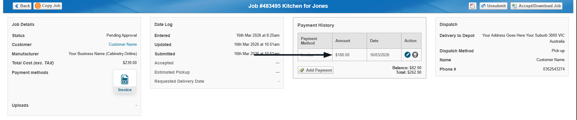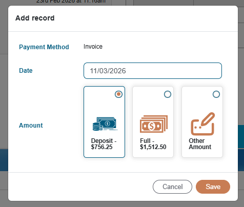 You can then nominate if a deposit, full payment, or other amount has been recieved, along with the payment date.